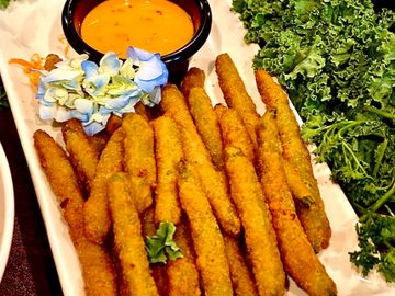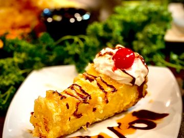 Crispy, golden brown, tempura outside with a smooth, sweet cream center and topped with salted caramel and chocolate syrup. Absolutely a Must Try Favorite!