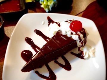 Deliciously rich and smooth chocolate torte finished with whipped topping and a cherry, of course!