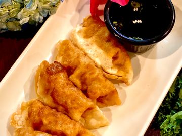 Crispy fried pork dumplings served with a savory dipping sauce.