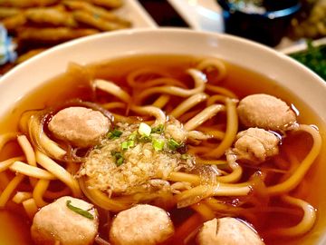 Thick noodles served in hot broth and choice of crispy tempura-fried side.